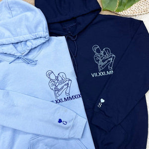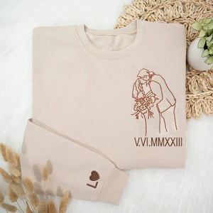 Turn your favorite couple photo into a delicate outline embroidery paired with Roman numerals representing your anniversary, creating a stylish, meaningful, and romantic piece you can wear every day. ๐โจ