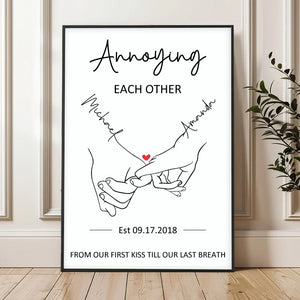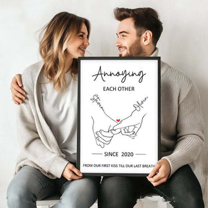 ❤️Featuring a minimalist line art design of two hands linked with a heart, it humorously captures the essence of love with the phrase "Annoying Each Other From Our First Kiss Till Our Last Breath." A perfect keepsake for couples who cherish their unique bond filled with love and laughter.