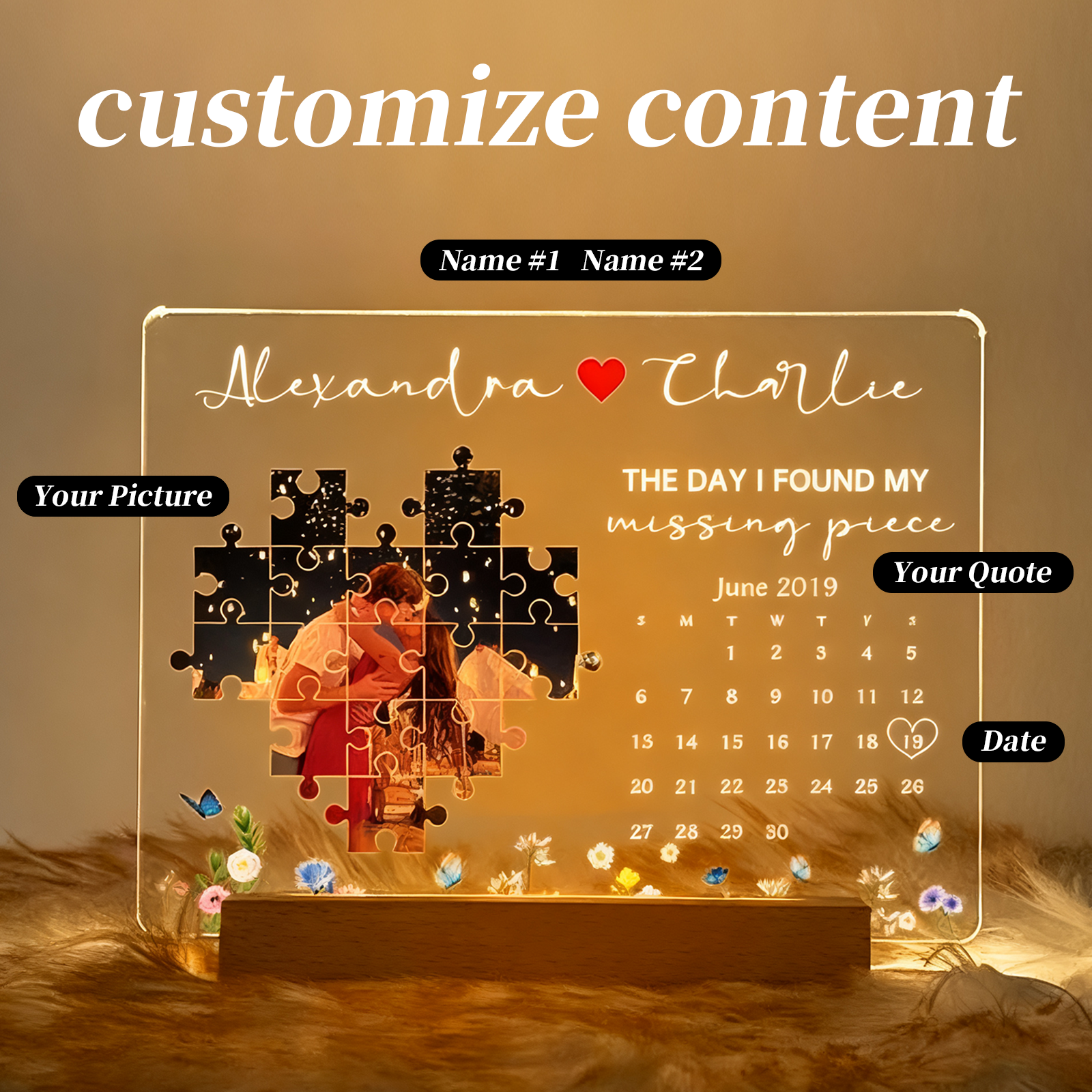 Celebrate the moment that completes your heart with the Day I Found My Missing Piece Lightbox. A unique, heartfelt gift designed to capture the essence of love, this personalized lightbox makes a perfect addition to any home. Whether it's for a romantic partner, a friend, or a family member, this gift will serve as a constant reminder of those precious moments that bring us together.